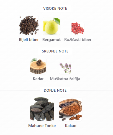 Srednje note: Začini, Sandalovo drvo, Korijander, Mahovina, Kedar, Cvet narandže, Jasmin, Ruža