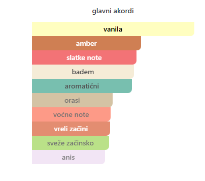- Bazne: Vanilija, Badem, Mahune Tonke, Benzoin, Kedar