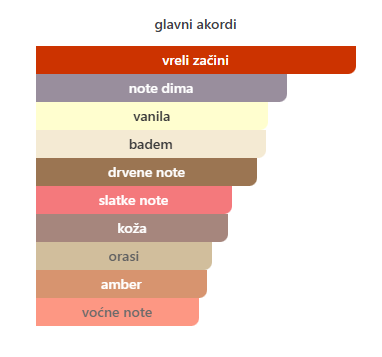 - Bazne: Dim, Mahune Tonke, Vanilija, Sandalovo drvo, Pačuli
