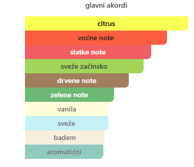 - Srednje: Đumbir, Badem, Crni biber, Jasmin