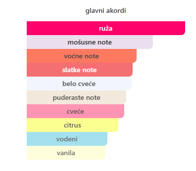 - Bazne: Bijeli mošus, Vanilija, Pačuli, Kedar