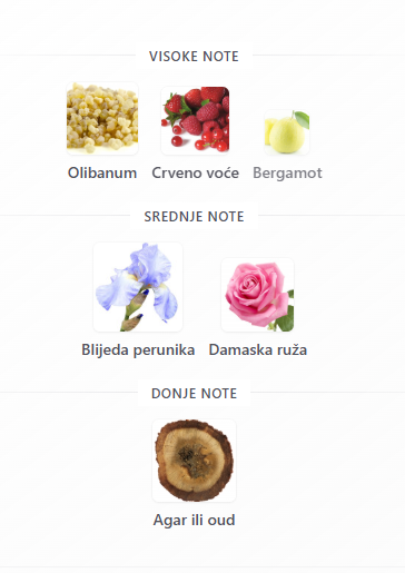 - Visoke: Olibanum, Crveno voće, Bergamot