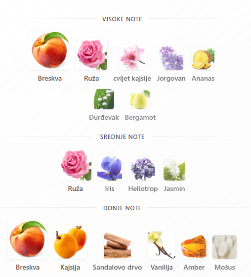 - Bazne: Breskva, Kajsija, Sandalovo drvo, Vanilija, Amber, Mošus