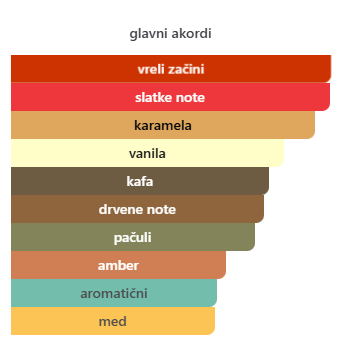 - Bazne: Kafa, Pačuli, Vanila, Mahune Tonke, Benzoin, Amber, Sandalovo drvo, Mošus