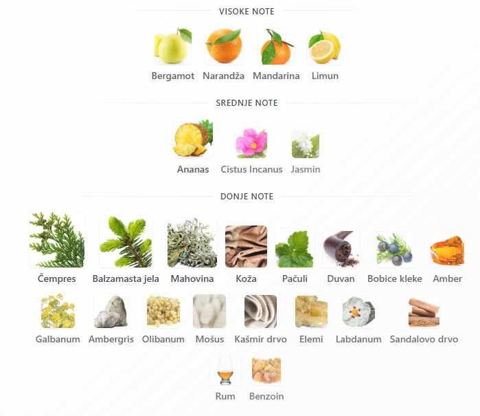 - Visoke: Bergamot, Narandža, Mandarina, Limun
