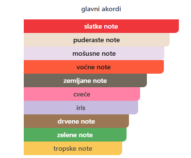- Bazne: Mošus, Amber, Vetiver, Vanila, Pačuli