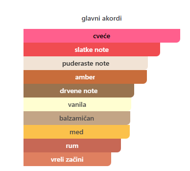 - Bazne: Vanila, Miro, Antilop, Sandalovo drvo, Peru balzam, Labdanum